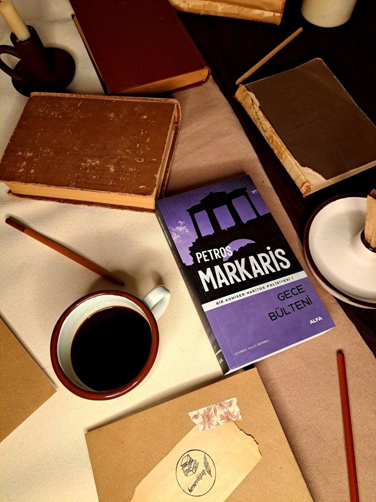Komiser Kostas Haritos serinin ilk kitabı olan Gece Bülteni,hayli karışık bir cinayetin soruşturmasını içerir.Atina’da Arnavut bir çiftin katledildiği cinayetle başlayan karmaşa Haritos tarafından çözülmeye çalışılır. Romanda göçmen sorunları işlenirken gerçekleri saptıran,gerçeklerden uzaklaşan medyaya bir eleştiri vardır.